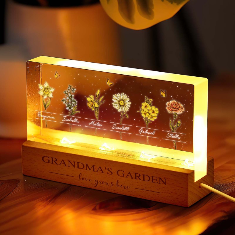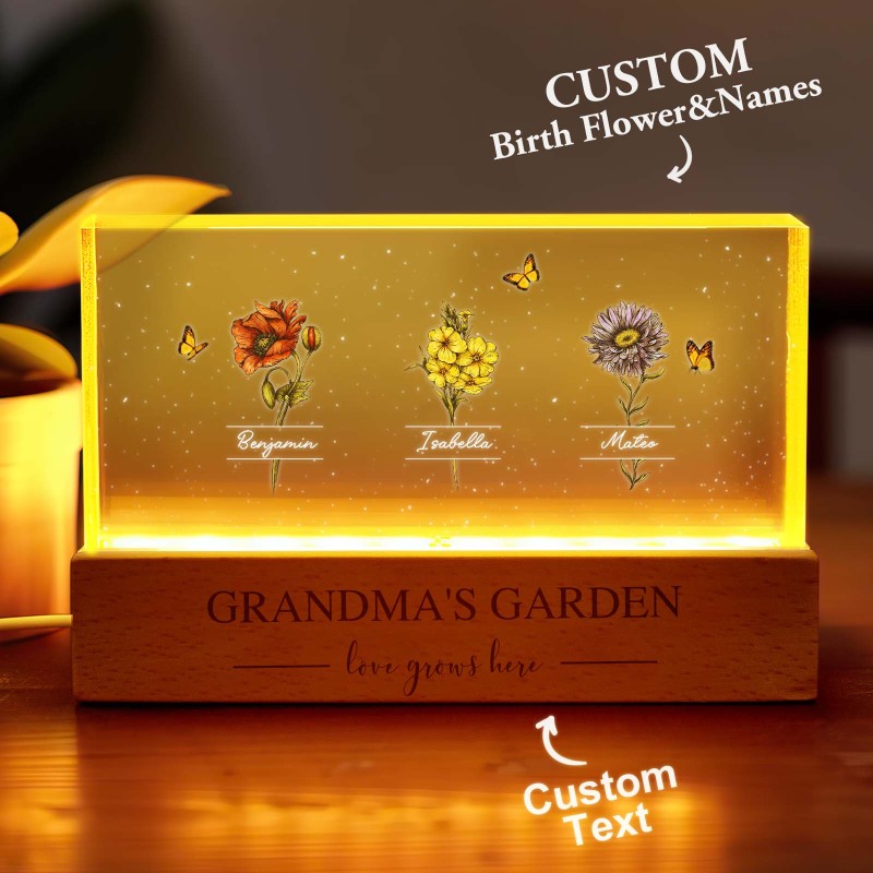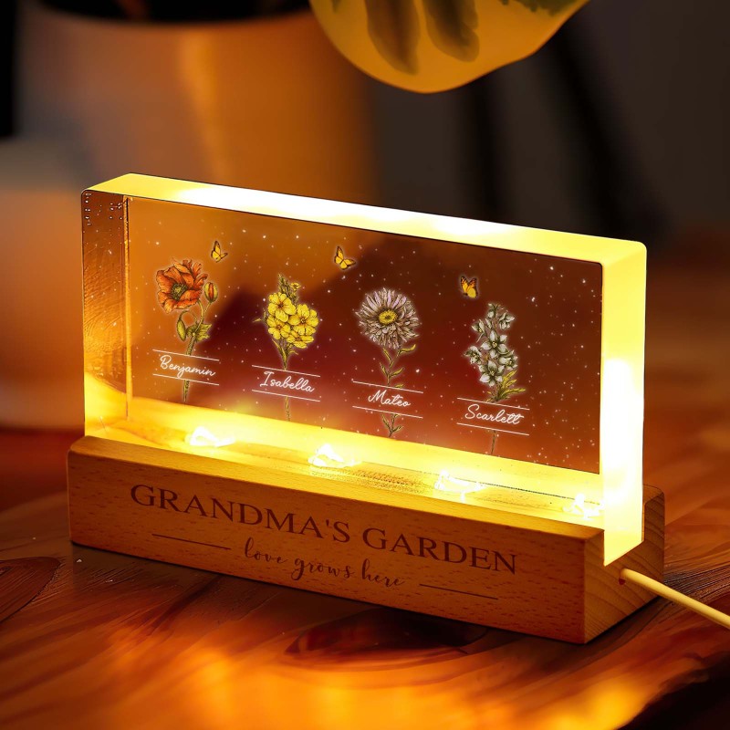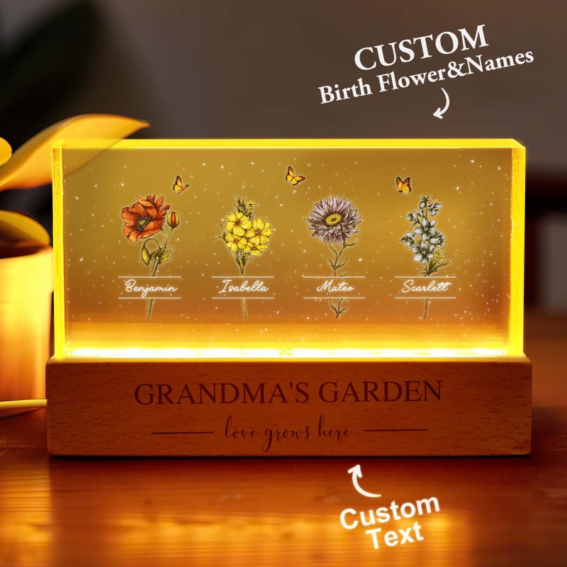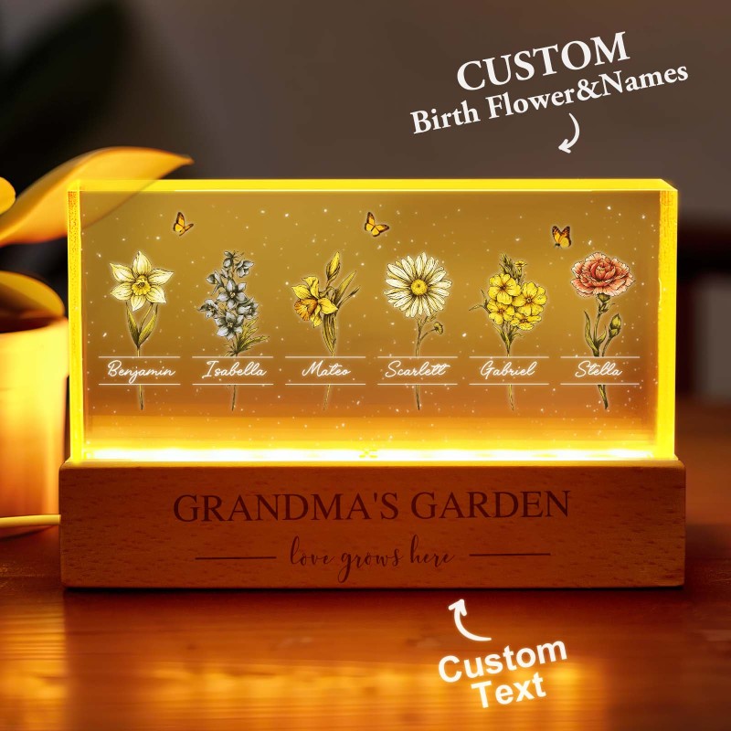 Veilleuse Led Personnalisée « Jardin De Grand-mère Avec Fleurs Du Mois De Naissance De Ses Petits-enfants », Cadeau Touchant Pour Grand-mère Et Maman