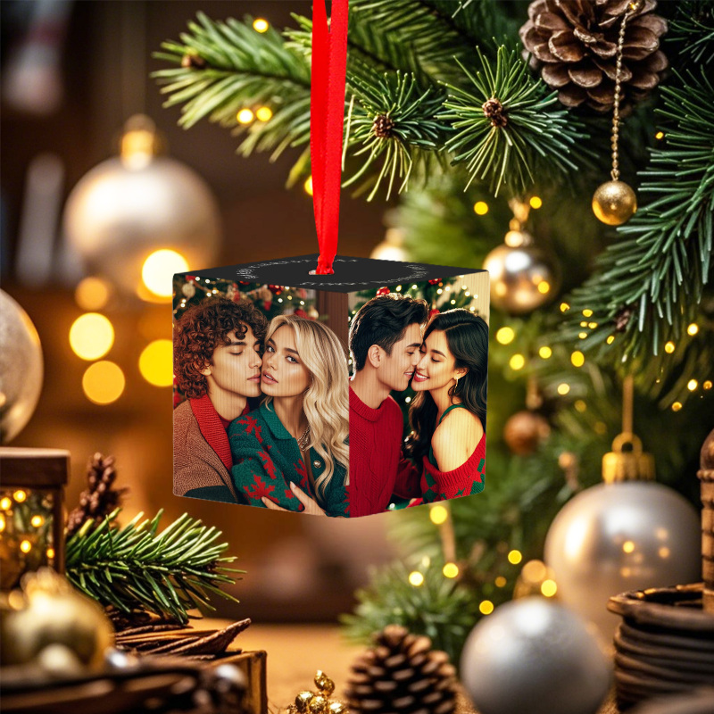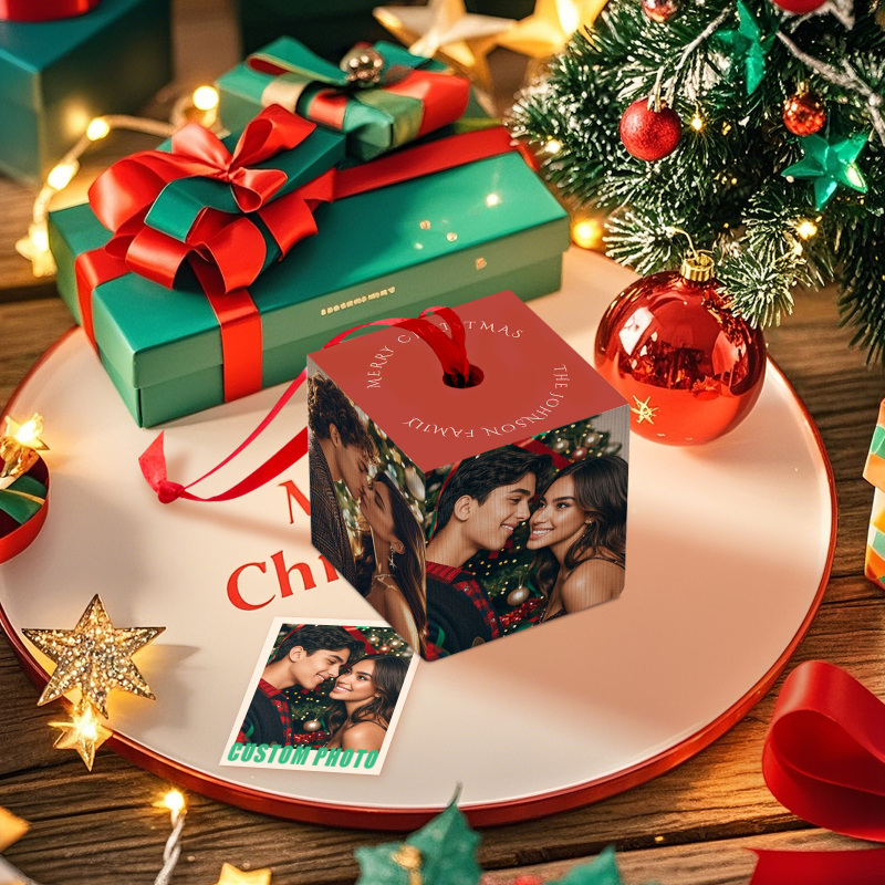 Joyeux Noël ! Cube Photo De Famille Rouge, Ornement Personnalisé Et Simple Pour 4 Photos.