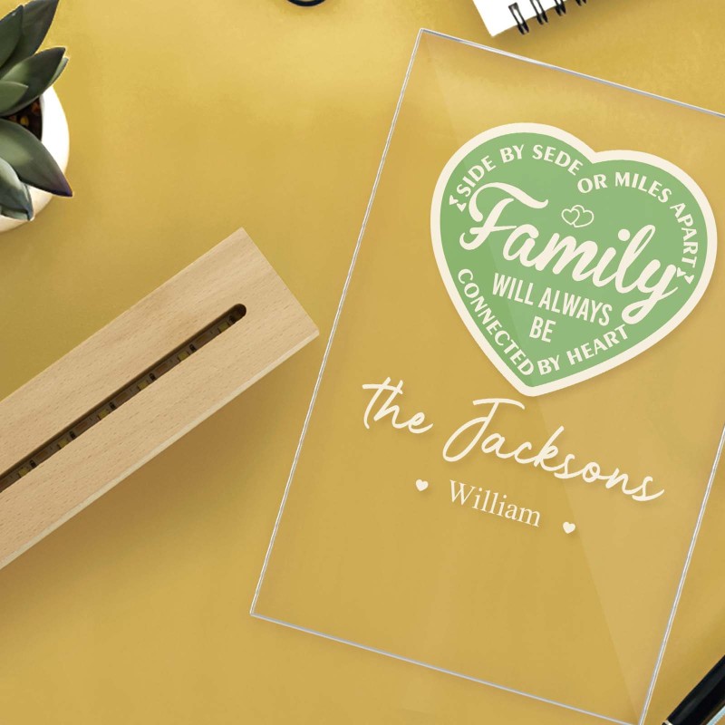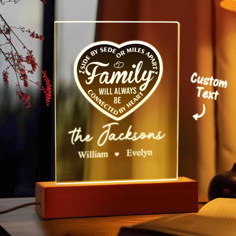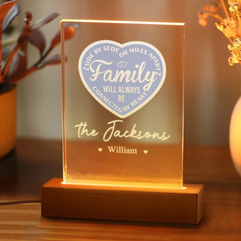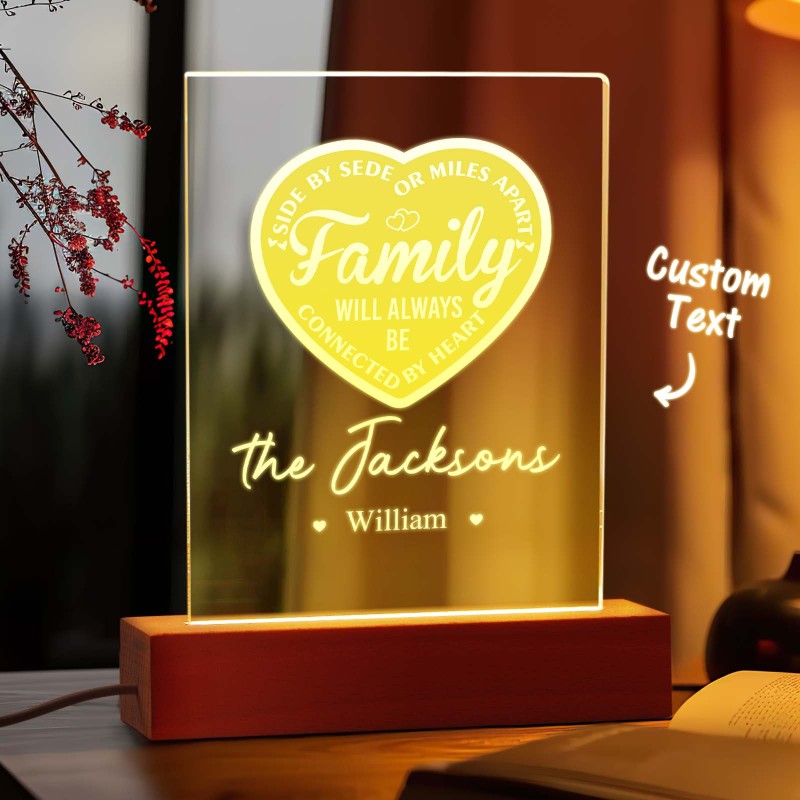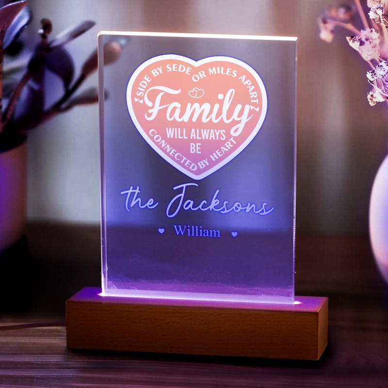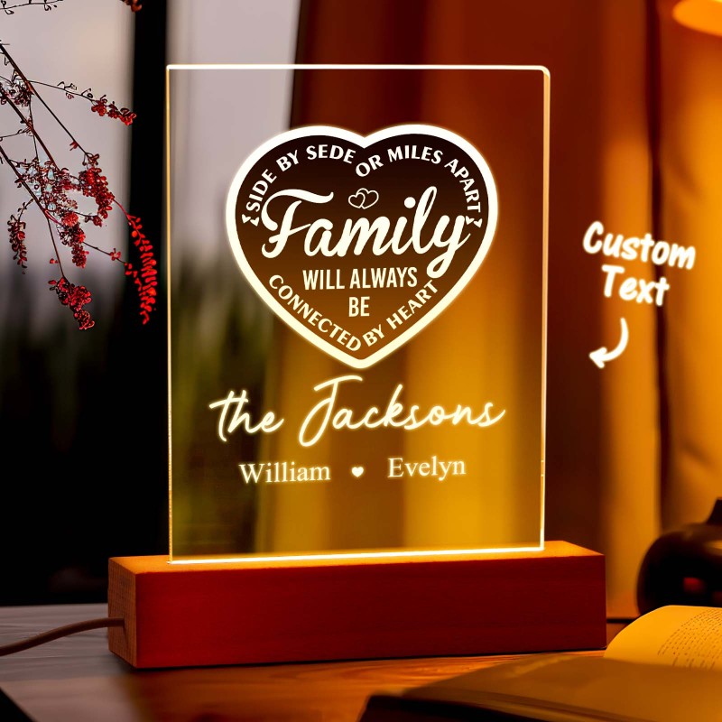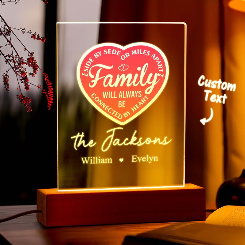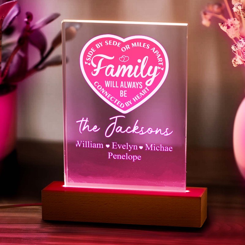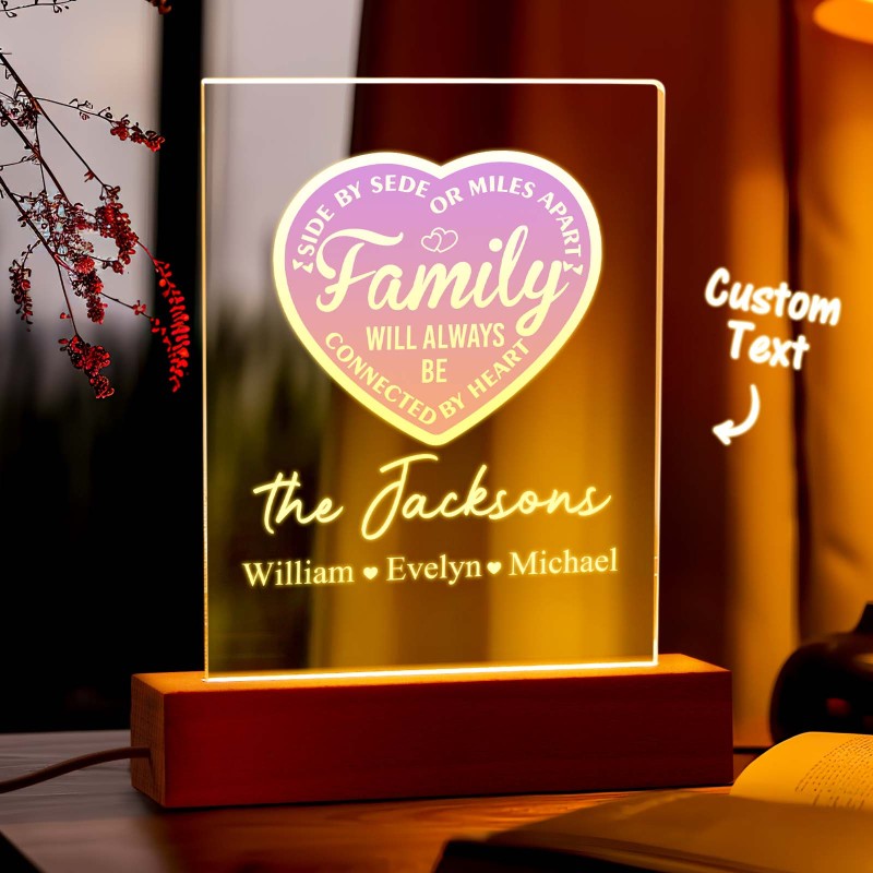La Famille Personnalisée Sera Toujours Connectée Par Cœur Veilleuse Led Avec 1 À 5 Noms Et Base En Bois, Cadeau D'adieu Pour Pendaison De Crémaillère Pour La Famille